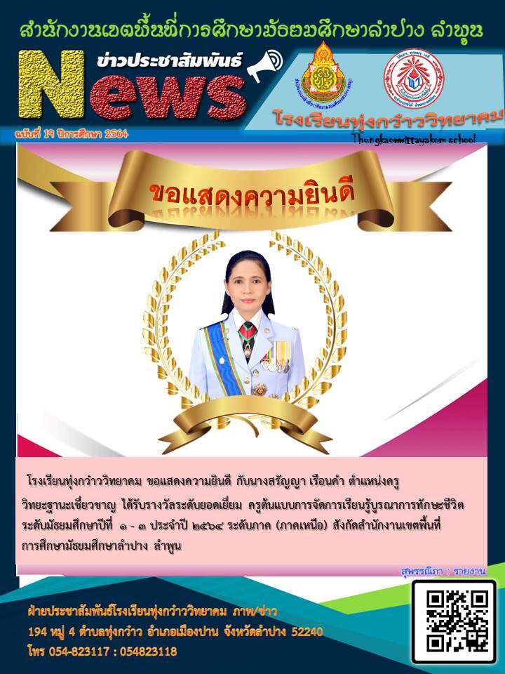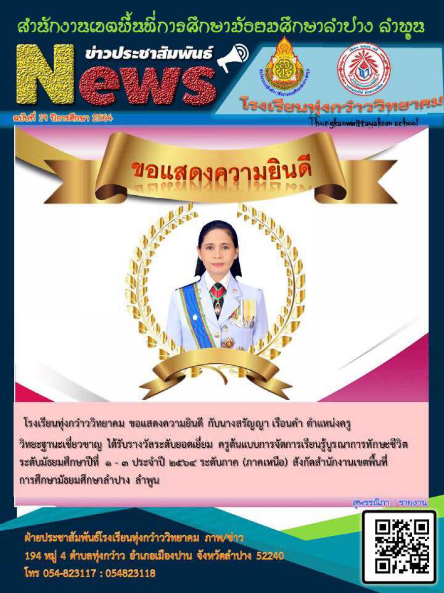 รางวัลระดับยอดเยียม ครูต้นแบบการจัดการเรียนรู้บูรณาการทักษะชีวิตชั้นมัธยมศึกษาปีที่ 1-3