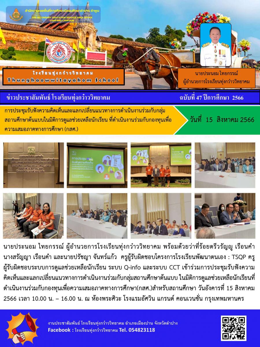 การประชุมรับฟังความคิดเห็นและแลกเปลี่ยนแนวทางการดำเนินงานร่วมกับกลุ่ม สถานศึกษาต้นแบบในมิติการดูแลช่วยเหลือนักเรียน ที่ดำเนินงานร่วมกับกองทุนเพื่อ ความเสมอภาคทางการศึกษา (กสศ.)