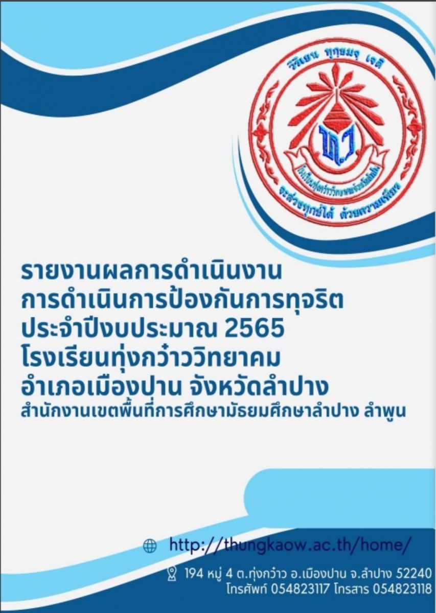 | รายงานผลการดำเนินการป้องกันการทุจริตประจำปี โรงเรียนทุ่งกว๋าววิทยาคม ประจำปีงบประมาณ พ.ศ. 2566 | รายงานกำกับติดตามการดำเนินการป้องกันการทุจริตประจำปีงบประมาณ 2565 |