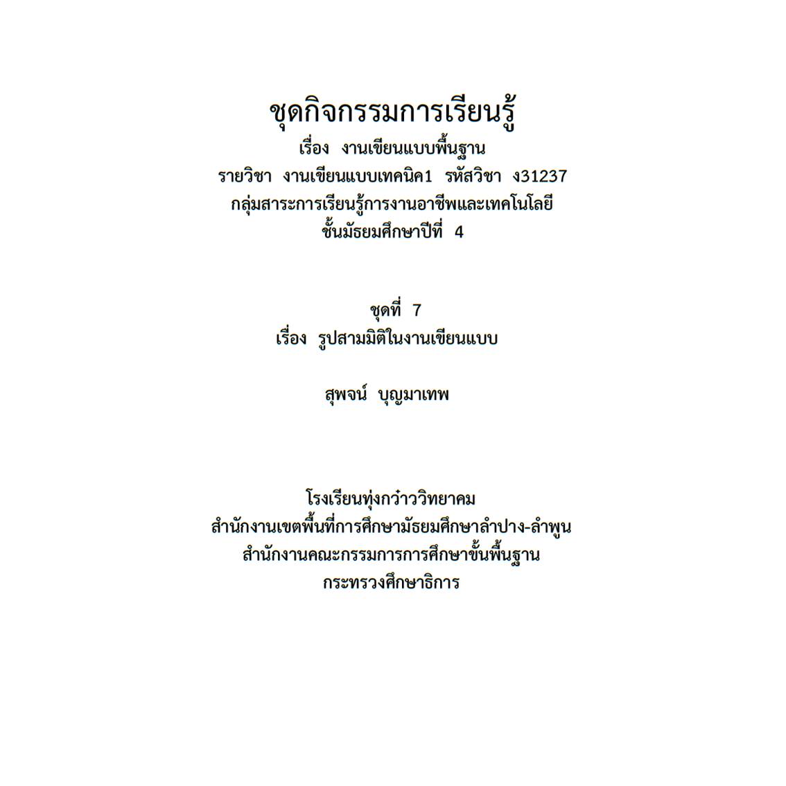ชื่อผลงาน ชุดกิจกรรมการเรียนรู้ เรื่อง งานเขียนแบบพื้นฐานรายวิชา งานเขียนแบบเทคนิค1 รหัสวิชา ง31237 กลุ่มสาระการเรียนรู้การงานอาชีพ ชั้นมัธยมศึกษาปีที่ 4 ชุดที่ 7
