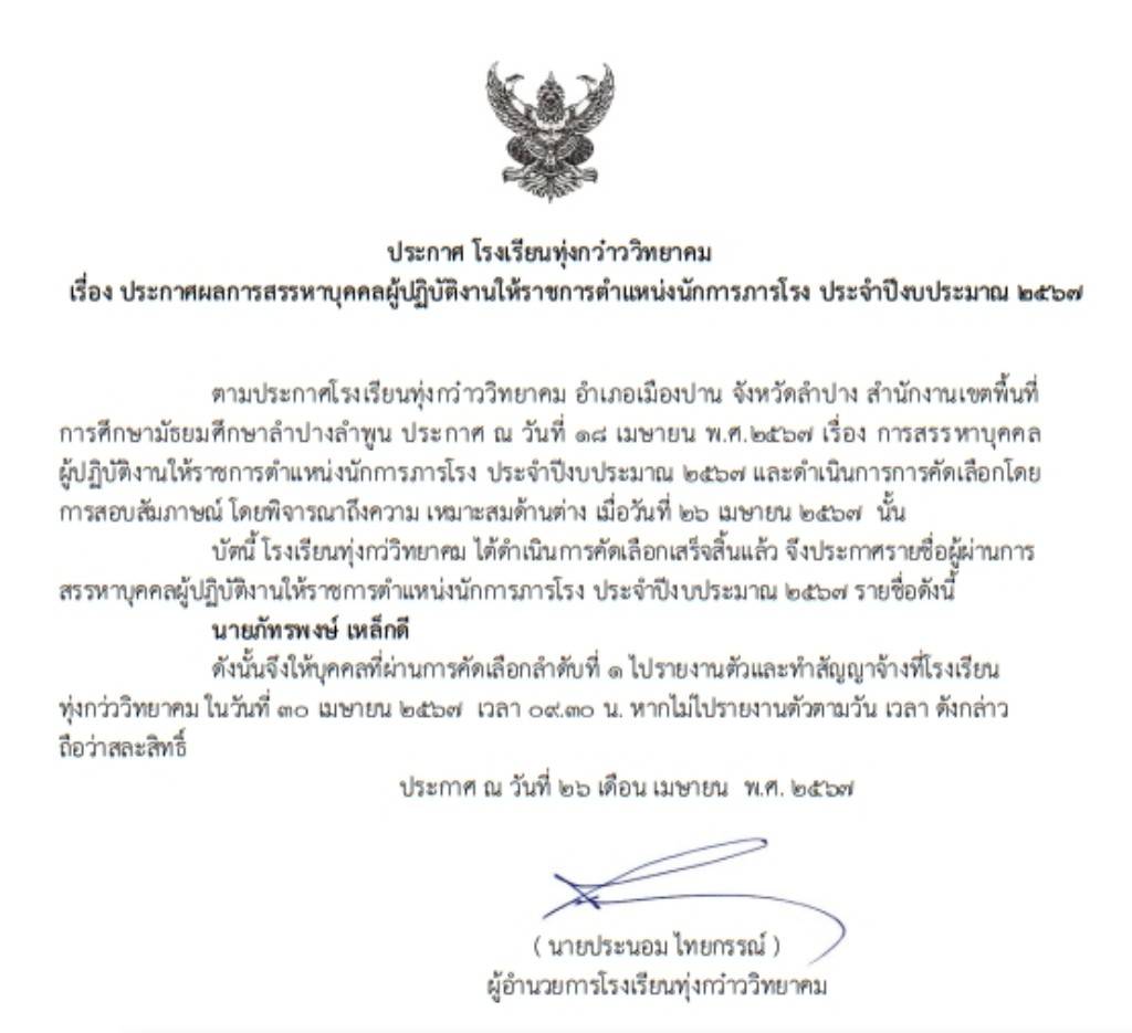 ประกาศผลการสรรหาบุคคลผู้ปฏิบัติงานให้ราชการตำแหน่งนักการภารโรง ประจำปีงบประมาณ 2567