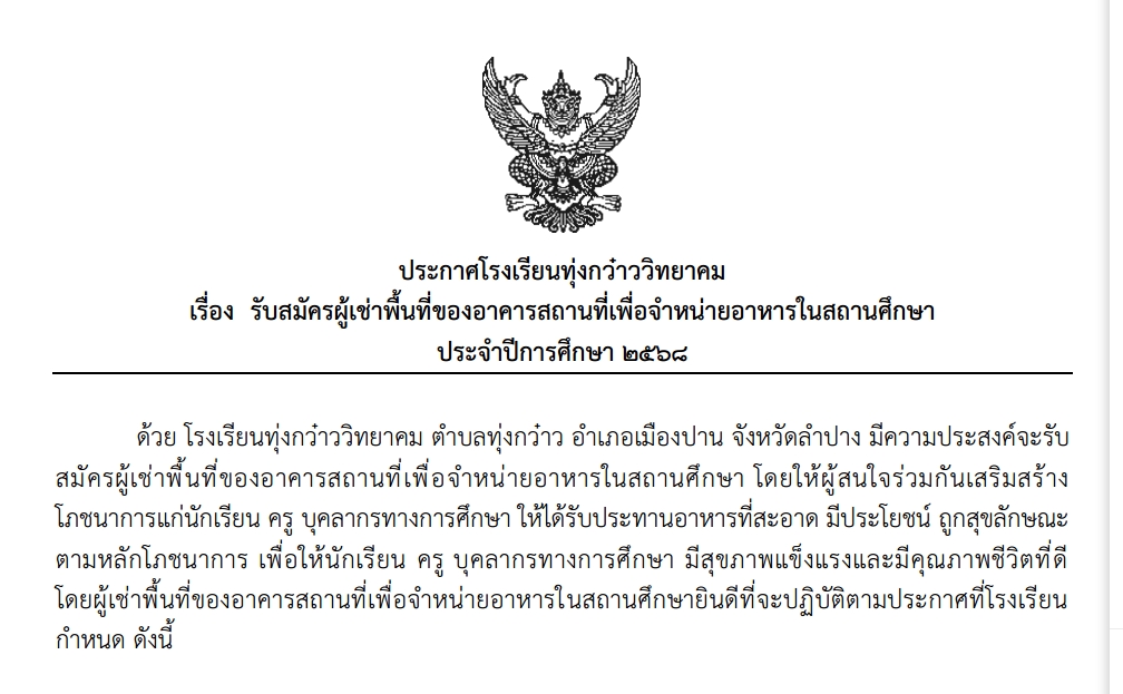 ประกาศโรงเรียนทุ่งกว๋าววิทยาคม เรื่อง รับสมัครผู้เช่าพื้นที่ของอาคารสถานที่เพื่อจำหน่ายอาหารในสถานศึกษา ประจำปีการศึกษา ๒๕๖๘
