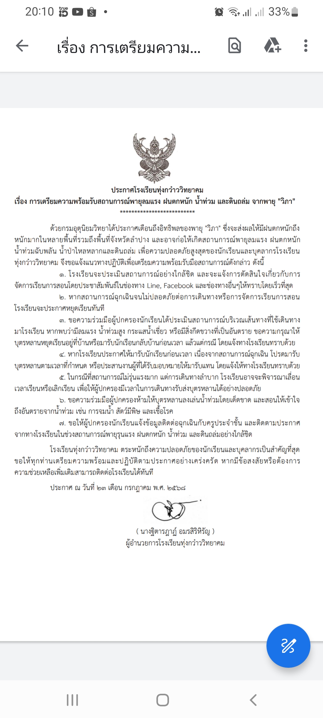 ประกาศโรงเรียนทุ่งกว๋าววิทยาคม เรื่องมาตรการการเตรียมความพร้อมรับมือ พายุวิภา