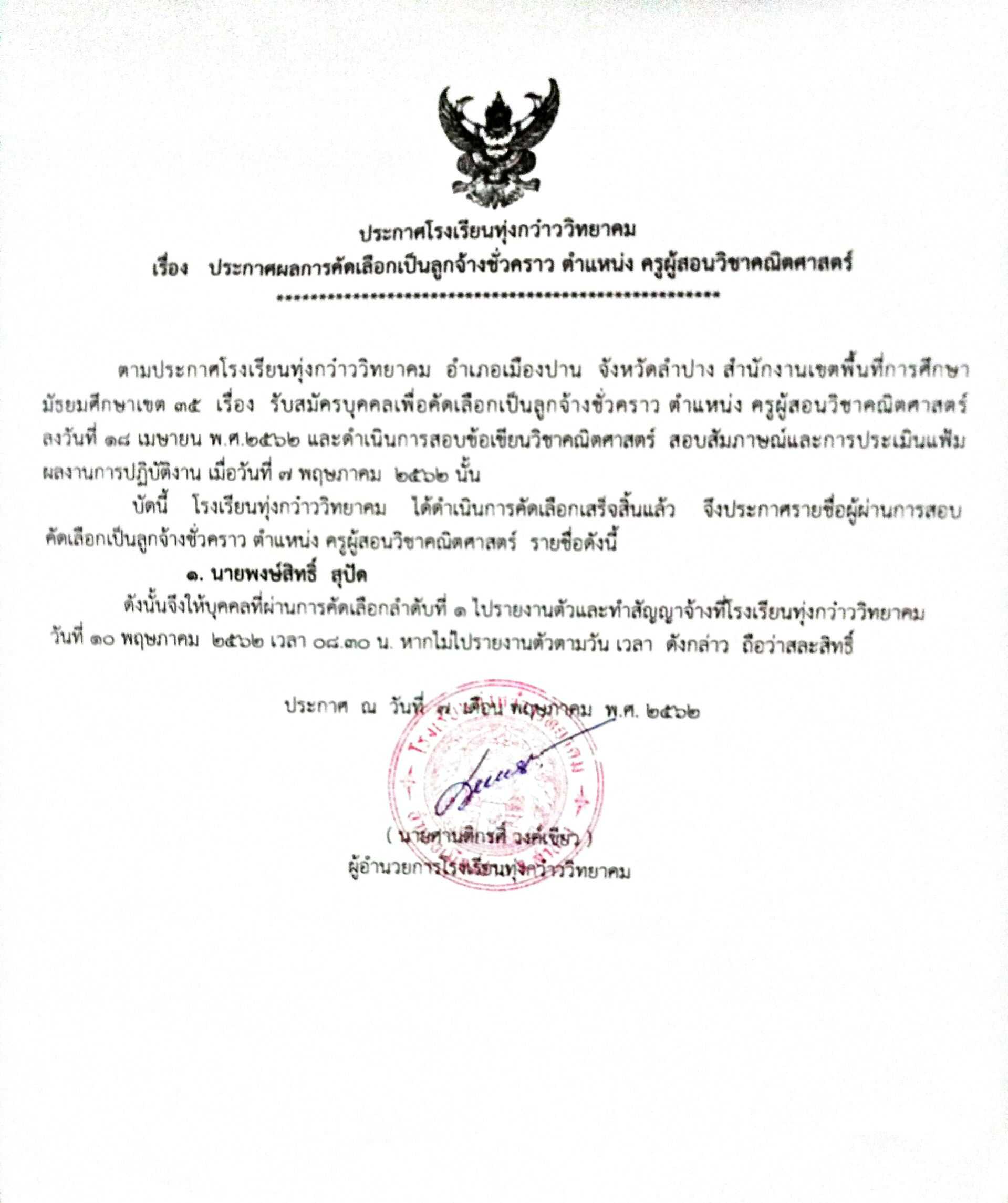 ประกาศผลการคัดเลือกเป็นลูกจ้างชั่วคราว ตำแหน่งครูผู้สอนคณิตศาสตร์