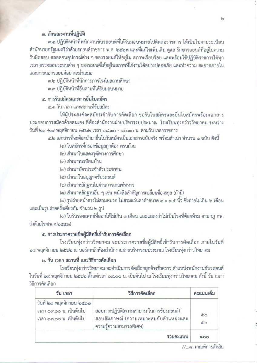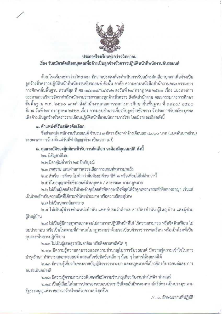 โรงเรียนทุ่งกว๋าววิทยาคม จะดําเนินการคัดเลือกลูกจ้างชั่วคราว ตําแหน่งพนักงานขับรถยนต์ ในวันที่ 29 พฤศจิกายน 2562 ตั้งแต่เวลา 09.00 น. เป็นต้นไป ณ โรงเรียนทุ่งกว๋าววิทยาคม ดังนี้ วัน เวลา วิธีการคัดเลือก