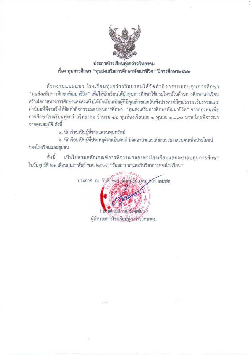 เรื่อง ทุนการศึกษา “ทุนส่งเสริมการศึกษาพัฒนาชีวิต” ปีการศึกษา๒๕๖๒