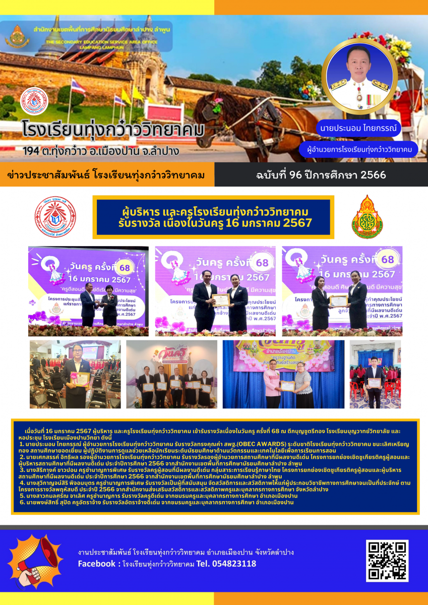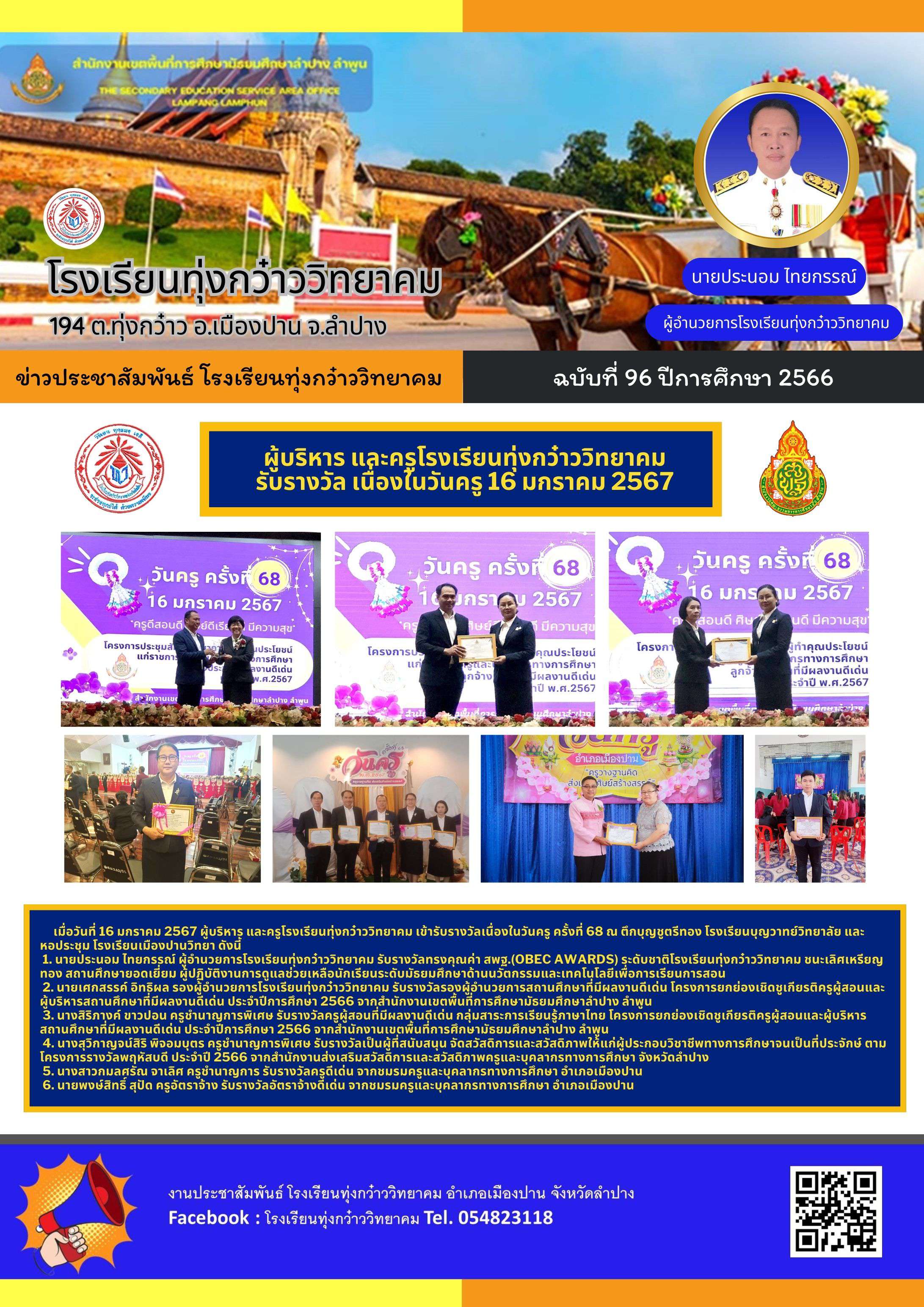 ผู้บริหาร และครูโรงเรียนทุ่งกว๋าววิทยาคม รับรางวัล เนื่องในวันครู 16 มกราคม 2567