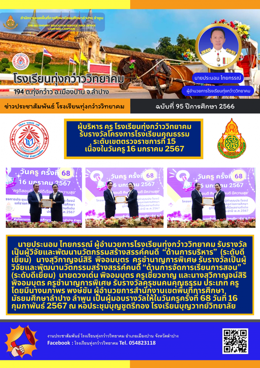 ผู้บริหาร ครู โรงเรียนทุ่งกว๋าววิทยาคม รับรางวัลโครงการโรงเรียนคุณธรรม ระดับเขตตรวจราชการที่ 15 เนื่องในวันครู 16 มกราคม 2567