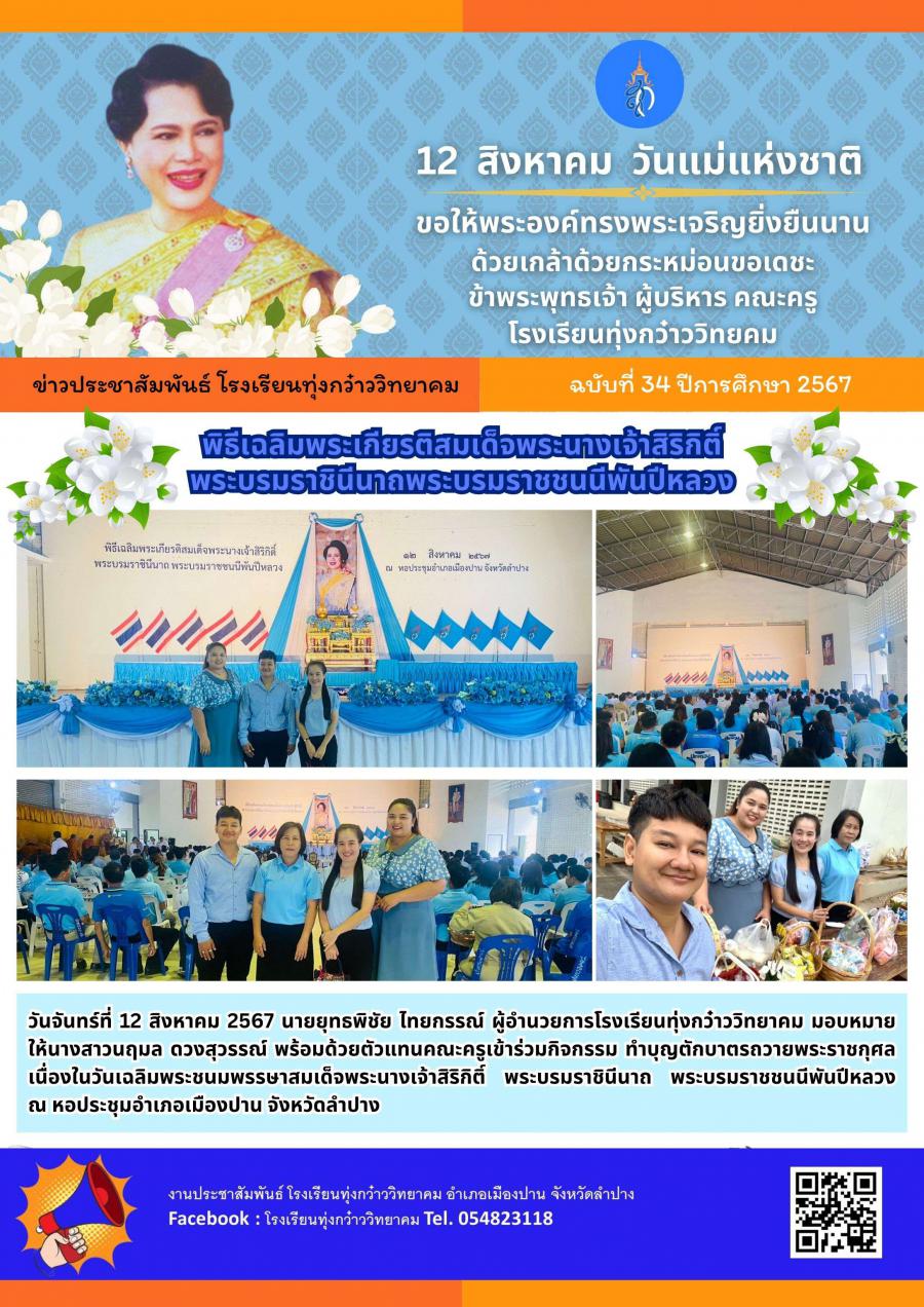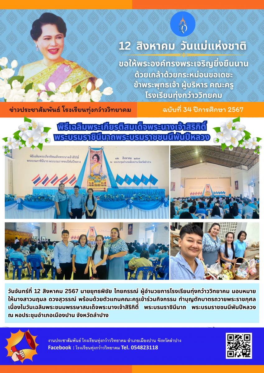 วันจันทร์ที่ 12 สิงหาคม 2567 นายยุทธพิชัย ไทยกรรณ์ ผู้อำนวยการโรงเรียนทุ่งกว๋าววิทยาคม มอบหมายให้นางสาวนฤมล ดวงสุวรรณ์ พร้อมด้วยตัวแทนคณะครูเข้าร่วมกิจกรรม ทำบุญตักบาตรถวายพระราชกุศล เนื่องในวันเฉลิมพ