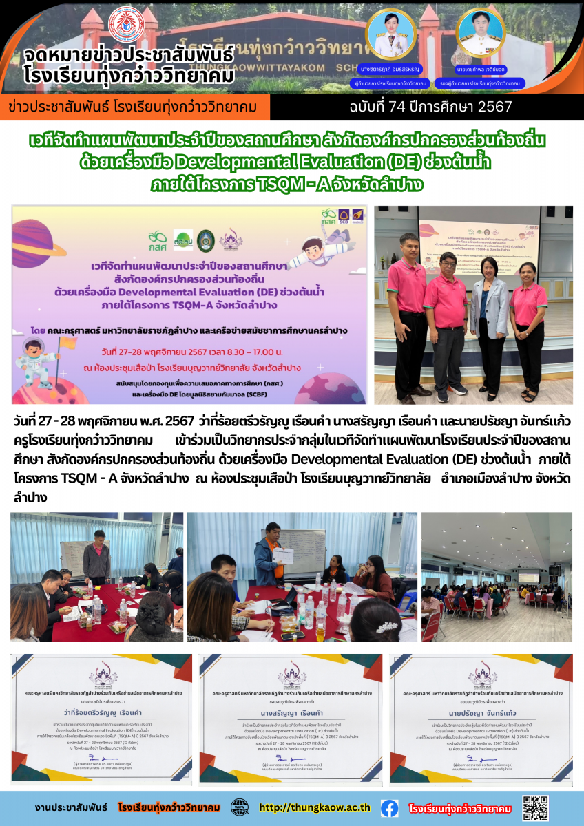 เวทีจัดทำแผนพัฒนาประจำปีของสถานศึกษา สังกัดองค์กรปกครองส่วนท้องถิ่น ด้วยเครื่องมือ Developmental Evaluation (DE) ช่วงต้นน้ำ ภายใต้โครงการ TSQM - A จังหวัดลำปาง