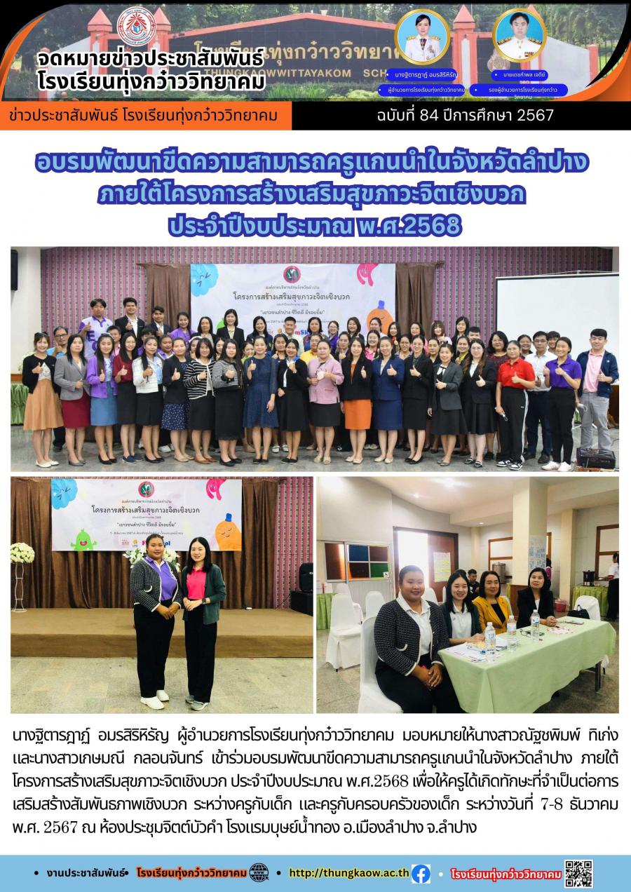 อบรมพัฒนาขีดความสามารถครูแกนนำในจังหวัดลำปาง ภายใต้โครงการสร้างเสริมสุขภาวะจิตเชิงบวก ประจำปีงบประมาณ พ.ศ.2568
