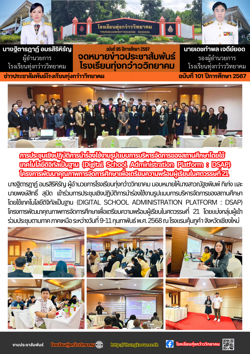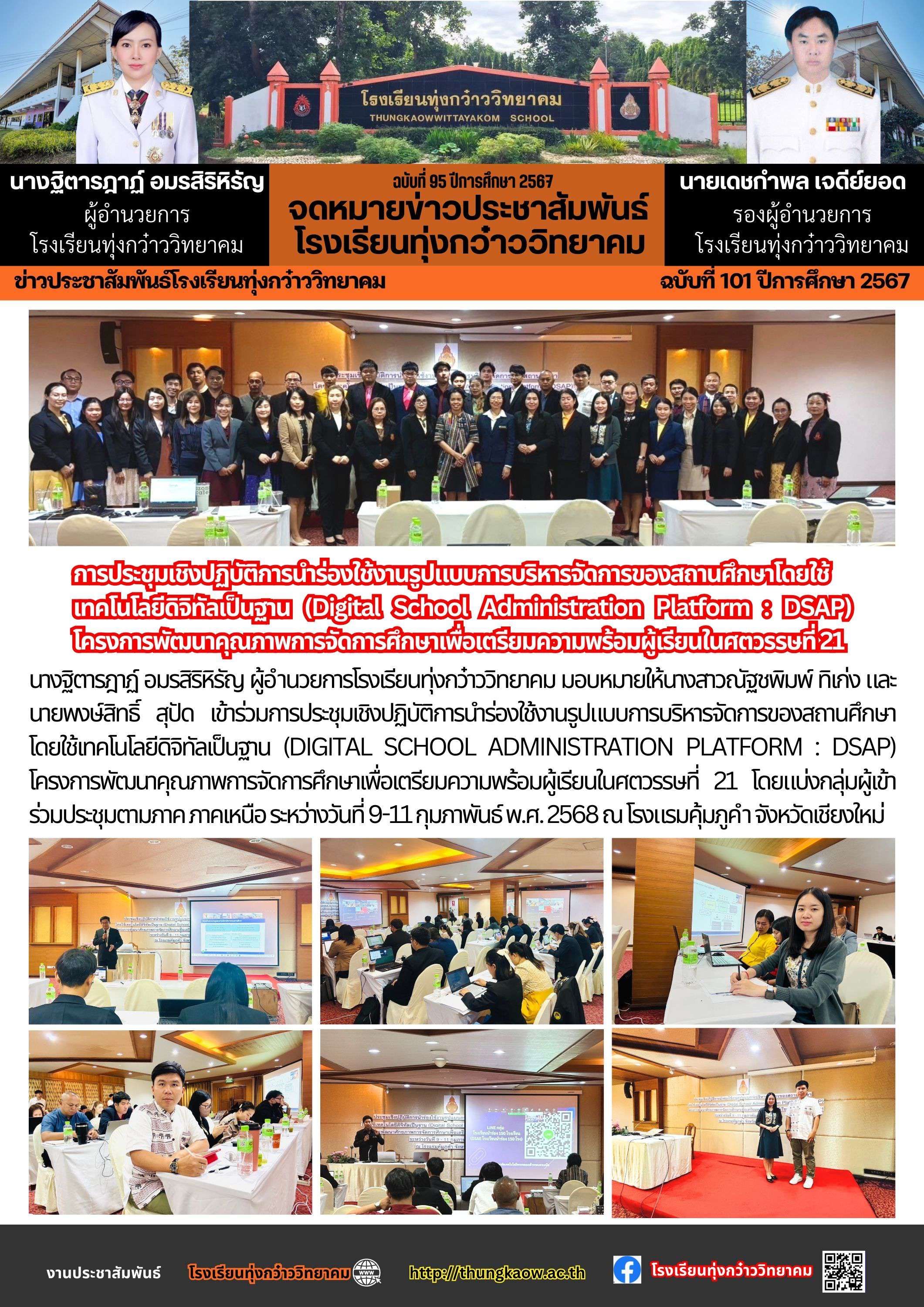 การประชุมเชิงปฏิบัติการนําร่องใช้งานรูปแบบการบริหารจัดการของสถานศึกษาโดยใช้เทคโนโลยีดิจิทัลเป็นฐาน (Digital School Administration Platform : DSAP) โครงการพัฒนาคุณภาพการจัดการศึกษาเพื่อเตรียมความพร้อมผ